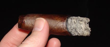 My prelight impression of this cigar was mostly favorable: it smells like well aged and fermented maduro leaf. The roll is solid and even, and the wrapper is invitingly oily. It has a few prominent veins that give it a rustic appearance. The only real flaw here is that the wrapper bleeds a bit. Time to get out my Michael Jackson smoking glove.