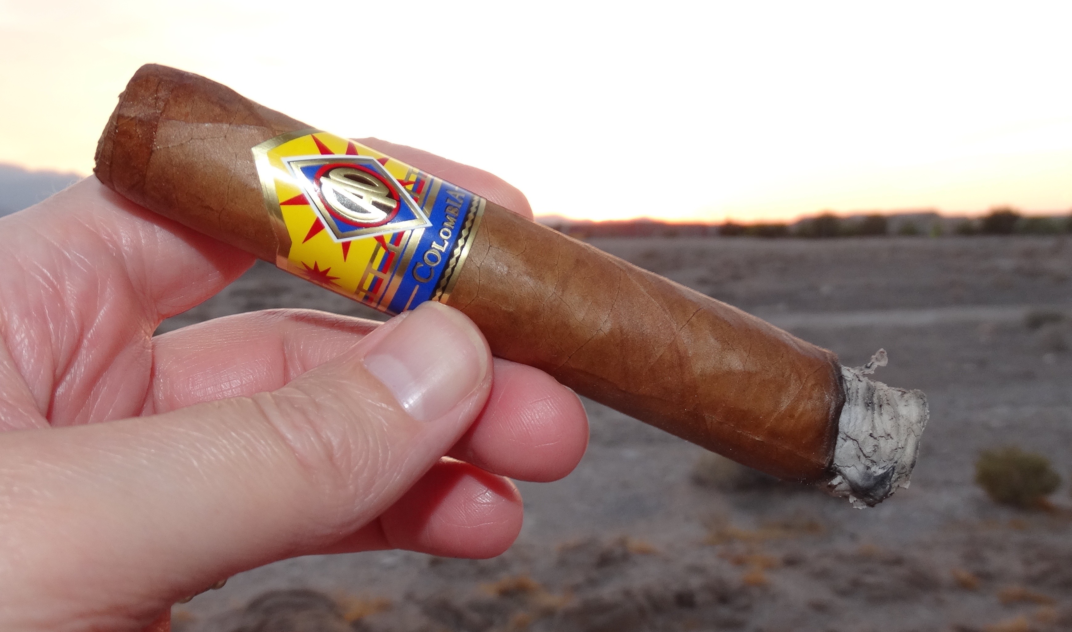 The CAO Colombia Tinto (robusto) is an attractive cigar with a glossy wrapper the shade of milk chocolate. There are some fine veins, but nothing to detract from this robusto’s uniform appearance. The roll is solid, the draw is easy, and it burns beautifully.