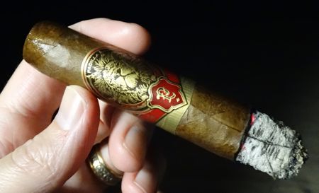 The Maduro starts out with a heavy, almost resinous pine which is slightly harsh on the tongue. It mellows out though as the pine turns to cedar with occasional spikes of bittersweet baker’s chocolate. It bangs this drum all the way to the end, making it somewhat one-dimensional, though still tasty. The aftertaste is tannic, with some black pepper toward the band.
